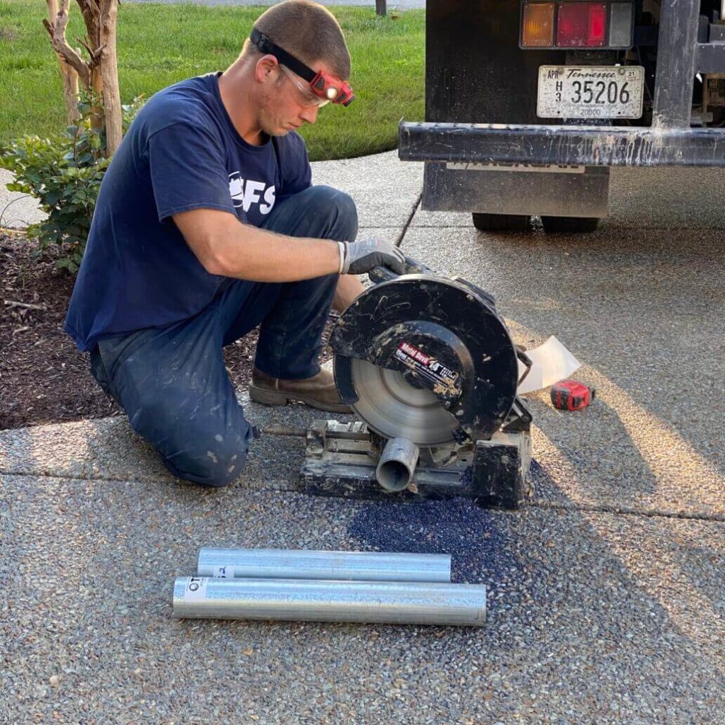 Once the holes were dug and filled, the team placed the base plates for the jacks to make it easier to correctly line up the beam above. Next, our team installed the steel tubing and I-beam.