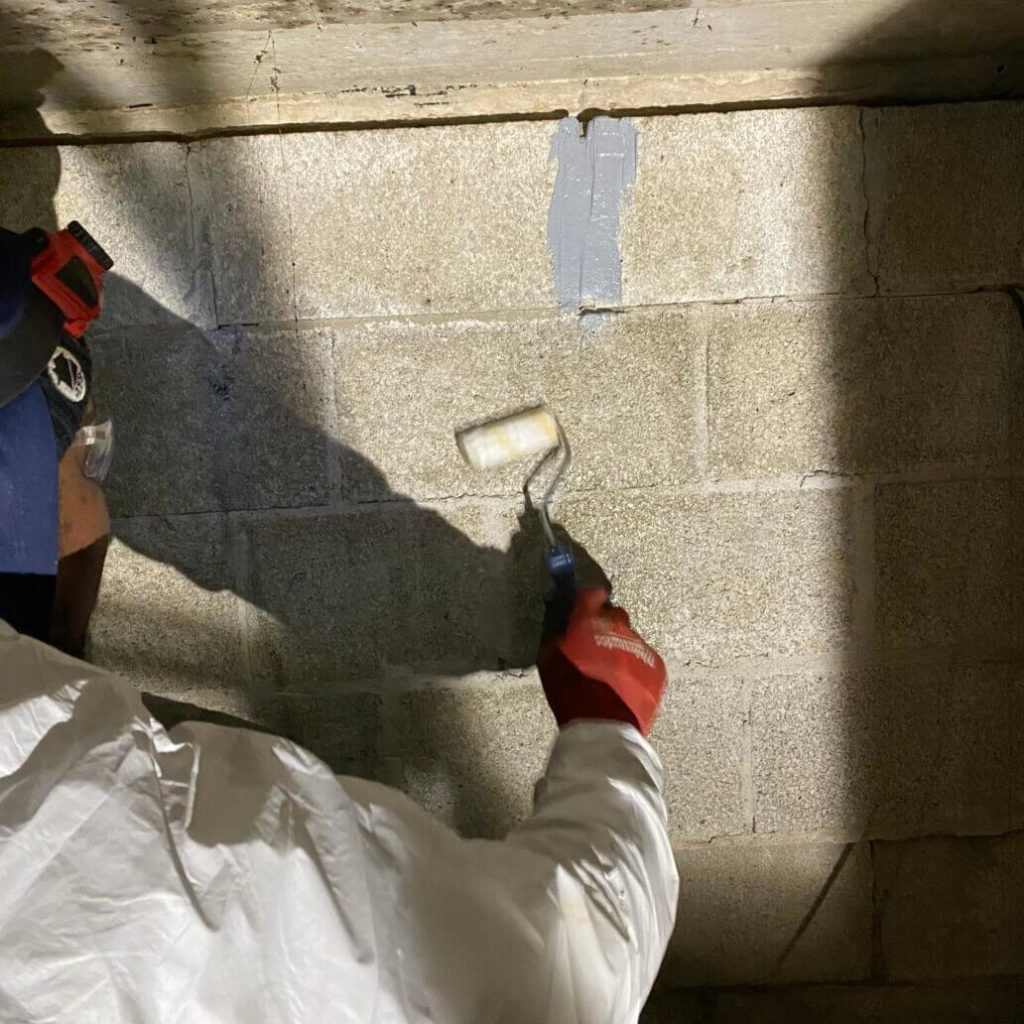 The crew dug to the footer of the home and prepped it for the pier brackets by grinding down a flat surface in the locations where each pier was installed. Once the wall and footer were prepped, it was time to mix the epoxy resin and cut the CarbonArmor material to the right size. The resin was then generously coated on both the wall and CarbonArmor strips and each strip was installed. Another layer of epoxy resin was rolled over the straps after they were installed.