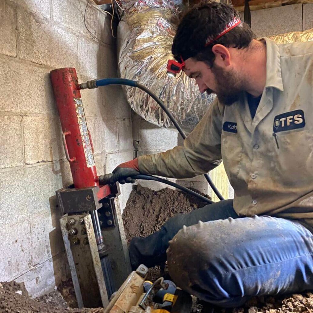 CarbonArmor consists of fiber-reinforced polymers and is ten times stronger than steel yet flexible enough to tightly contour to walls and provide added support. Our Push Piers are the best solution in our industry to permanently stabilize the foundation of a home. This specific project required 2 Carbon Armor straps placed on the inside of the bowing wall and 3 Push Piers inside the crawl space.